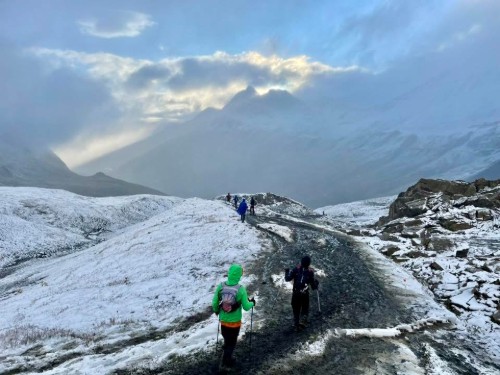 I had entered the ballot some time earlier this year and didn’t get in, and then looked to doing other races instead. However, 6 weeks before the race, I received an email from the UTMB team, saying they had offered a few race entries (still had to pay) to women as part of the Women In Trail programme. I initially thought it was a scam, but after some digging around, I found out it was legit. I was very shocked and uncertain about what to do, and only had a few days to make a decision. I discussed this opportunity with a few people, and the general feel was just to go for it! It’s not cheap, but I felt relatively fit to give it go. It just meant I had 5 weeks to ramp up my training and plan the logistics. Stressful! Fast forward to race day, and the cold weather kit was already activated. The start line was crowded and they played the iconic ‘Conquest of Paradise’ – Vangelis song, cue the tears and goosebumps. I’ve never been so nervous, it felt surreal standing there about to take on the UTMB. The moment we set off it began to rain and basically didn’t stop. Beyond 30km the weather got worse, and we had to deal with sleet/snow, mud and cold temperatures. It was grim, even with 2 gloves and hand warmers, my hands were in pain from the cold. Fuelling was hard, aid stations were chaotic and busy. They had changed one section of the course during the race as the weather had worsened. All I wanted, was to reach the 80km point/bag drop where Ben was meeting me (he was my crew support, and did a great job supporting me emotionally and making sure my kit and fuelling was sorted). It was 10-11am by the time I met him, the weather improved and warmed up. I changed into fresh clothes, changed trainers and ate hot pasta. I was familiar with the next 80km+ of the route, so my main focus was to keep moving swiftly and not delay too much at aid stations.
