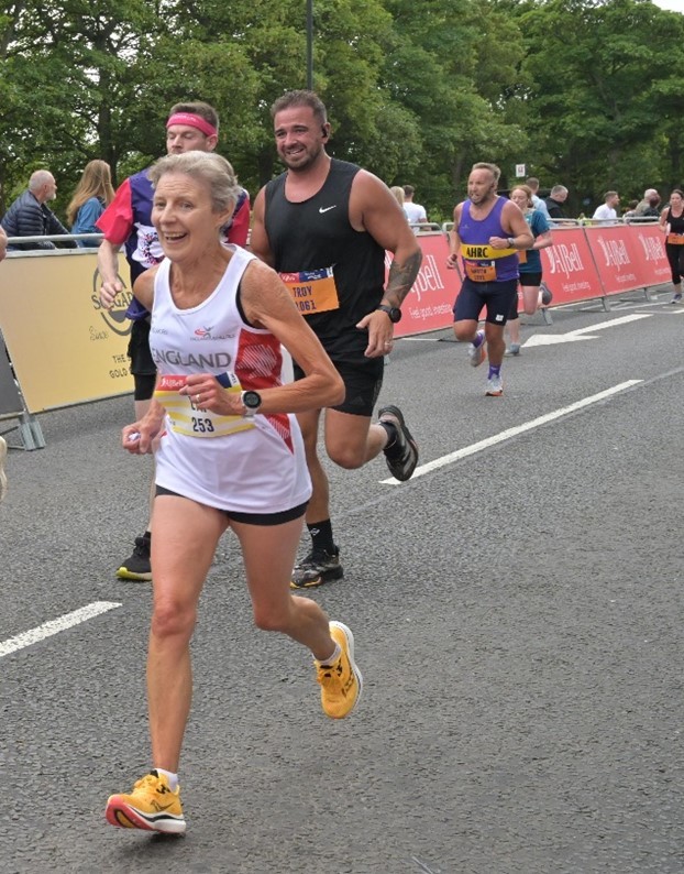 On Sunday 6th July I was very proud to be one of two Westbury Harriers in the 150 strong England team competing in the 2025 International Representative Masters 10k at the Great North 10k. The course was challenging with 3k downhill initially and then the last 6k was mostly uphill with a long uphill finish. David Tonkin completed the course in 36.06, coming in 16th M45. I finished a lot slower, at 53.09, but was very pleased to be 4th W70, especially after 2 months off with an injury and only 3 weeks back in training. I even managed a 5k PB! It was an amazing experience, especially to start right at the front with the elite athletes.